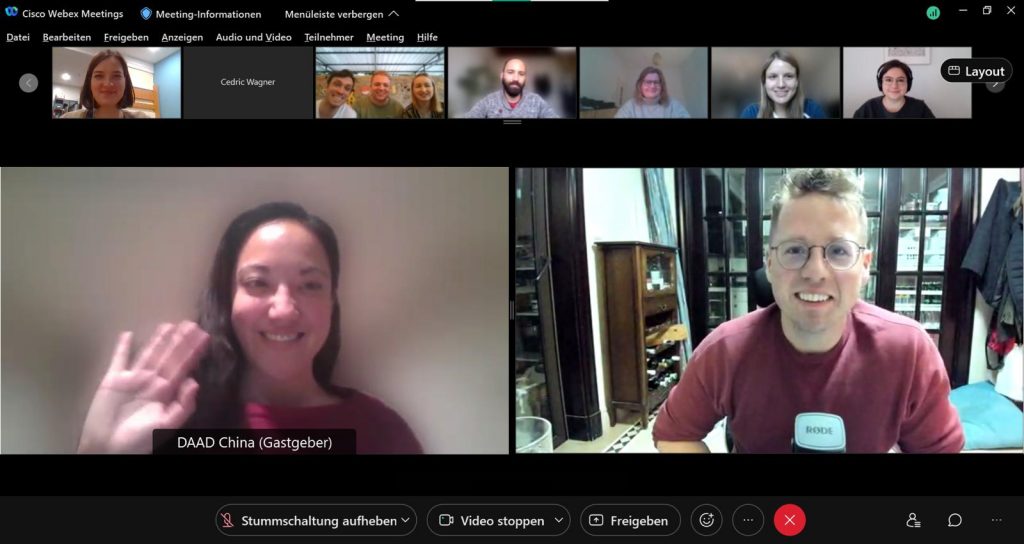 Jakob: Das Rahmenprogramm wird von unserer Koordinatorin der DAAD-Außenstelle Peking, Melanie Späthe, organisiert. Circa alle ein bis zwei Wochen lernen wir unterschiedliche Menschen oder Unternehmen kennen. Hierbei werden auch die Interessen der Stipendiaten berücksichtigt. Im bisherigen Rahmenprogramm haben wir unter anderem den Bestsellerautoren Frank Sieren, den in China berühmten deutschen Internetstar „Afu“ Thomas Derksen, sowie verschiedene Topmanager deutscher bzw. chinesischer Firmen in China treffen können. Es ist immer wieder spannend zu sehen, wer sich alles für uns StipendiatInnen Zeit nimmt. Und gerade, weil die Treffen virtuell und in kleiner Runde stattfinden, lernt man die Menschen meist persönlicher kennen.